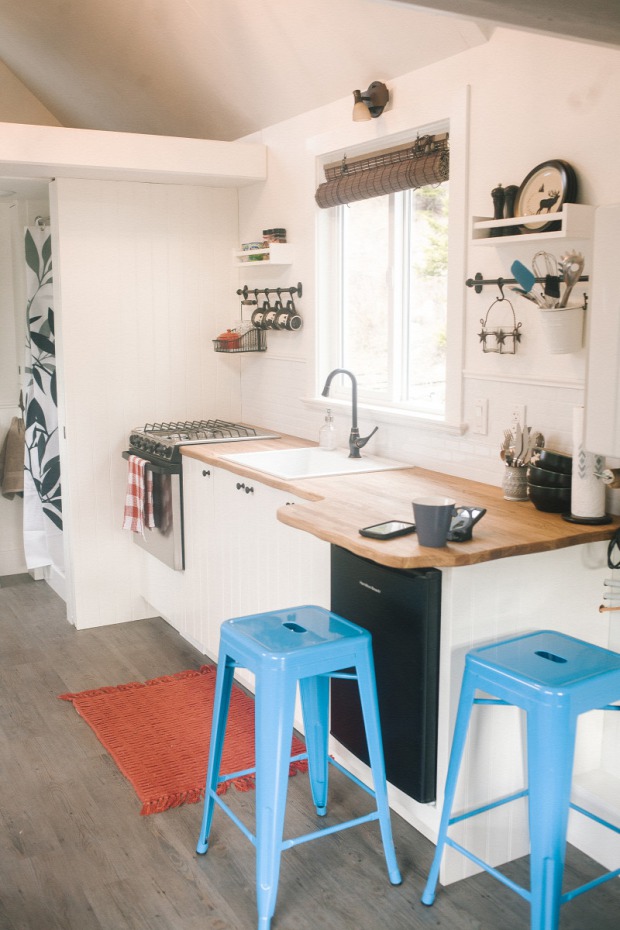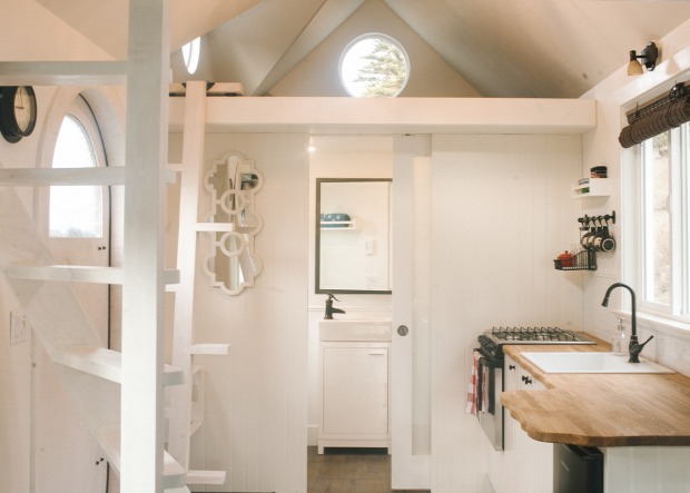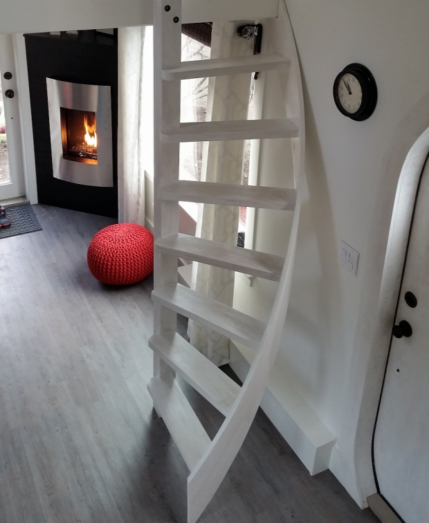 A házikó 26 négyzetméteres alapterületéből egy jól átgondolt megközelítéssel valóban élhető teret próbáltak megvalósítani. A konyhába boltíves mennyezet került, mert itt tölti a legtöbb időt állva az ember a lakásban; olyan csavart lépcsőt építettek, aminek fokain keresztül átlátni, ettől szellőssé, nyitottá válik az élettér.