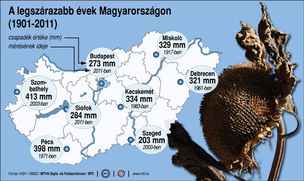 A legszárazabb évek Magyarországon 2012-08-24 energiaoldal Hírek, Klímaváltozás A legszárazabb évek Magyarországon (1901-2011) mért csapadék; mm MTI FacebookTweetPin aszálycsapadékcsapadékmennyiségklímaváltozásmagyarországszárazság