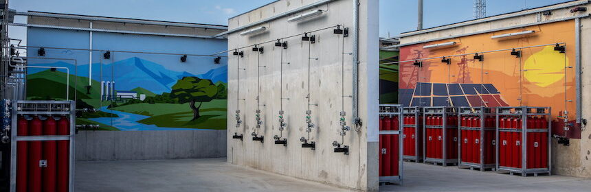 Tartályok Magyarország első hidrogén-előállító üzemében, a Békés vármegyei Kardoskúton az avatás napján, 2023. május 9-én. Az Akvamarin Projekt keretében a Magyar Földgáztároló Zrt. egy 2,5 megawatt összteljesítményű elektrolizáló rendszert és a hozzá tartozó hidrogén gázelőkészítő technológiát létesített a Kardoskúti Földalatti Gáztárolónál.