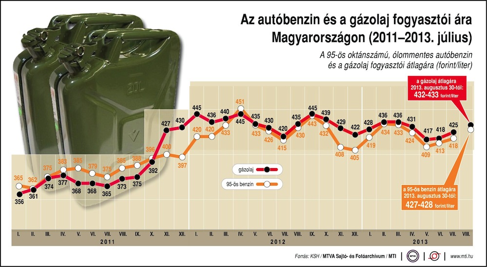 Az autóbenzin és a gázolaj fogyasztói ára 2013-08-30 energiaoldal Közlekedés A 95-ös oktánszámú, ólommentes autóbenzin és a gázolaj, havi, országos fogyasztói átlagára Magyarországon, 2011-2013. július MTI FacebookTweetPin benzin árabenzinárgázolaj áragázolajármagyarország