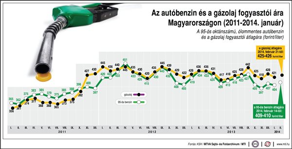 A benzinár 2012 április elején érte el csúcsát, akkor egy liter átlagosan 451 forintba került. A gázolaj literje 2012 január közepén volt a legdrágább, átlagosan 449 forint.