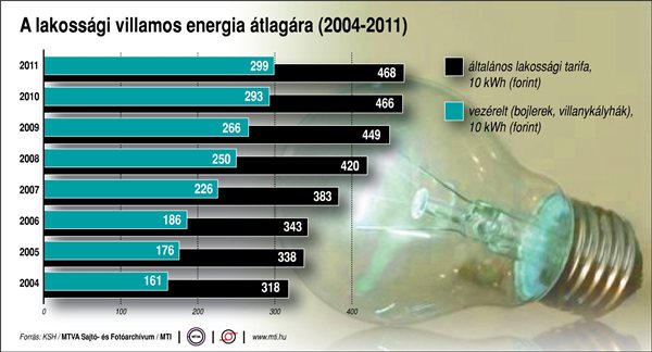 A Mavir adatai szerint a nettó magyarországi villamosenergia-fogyasztás 2011-ben 36 358 gigawattóra volt, ebből az áramszolgáltatók értékesítése 12 888 gigawattóra. A háztartások villamosenergia-fogyasztása tavaly 10 879 gigawattórát tett ki.