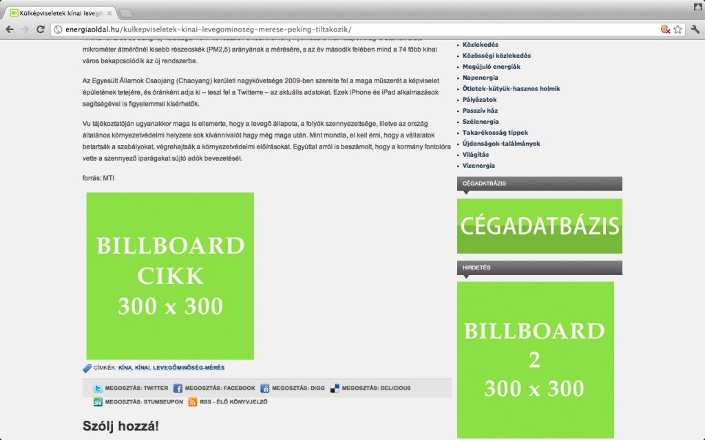 Billboard 2 a jobb oldalon és/vagy a cikkekben 300×300. Állandó, vagy rotálódó