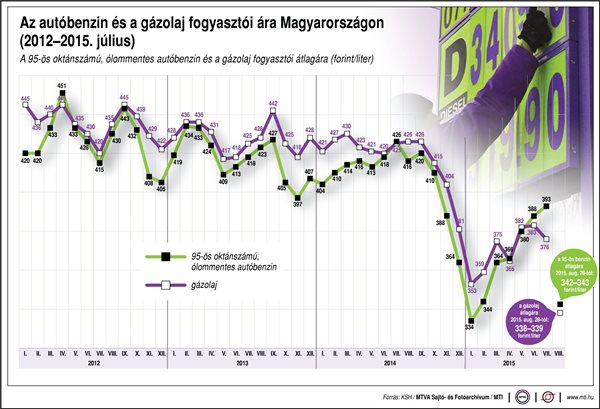 A benzin literenkénti átlagára tavaly szeptember és 2015 január között mintegy 100 forinttal csökkent, majd idén július közepéig fokozatosan több mint 70 forinttal emelkedett. Az utóbbi egy hónapban viszont csaknem 40 forinttal ismét olcsóbb lett a benzin.
